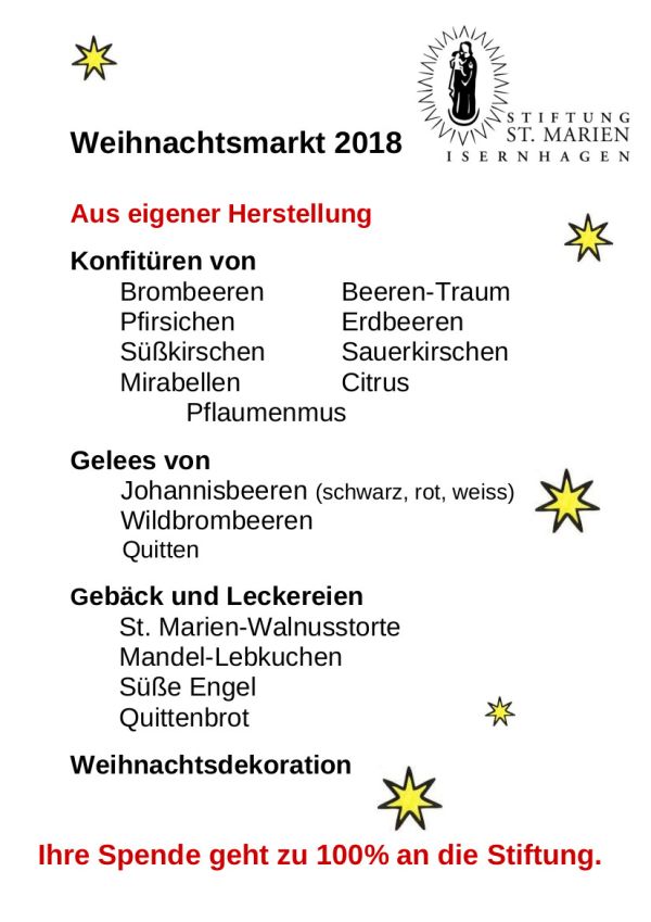 Die Stiftung St. Marien wird auch wieder in einer eigenen Marktbude Selbstgemachtes, wie Marmelade, Kekse und Basteleien anbieten.